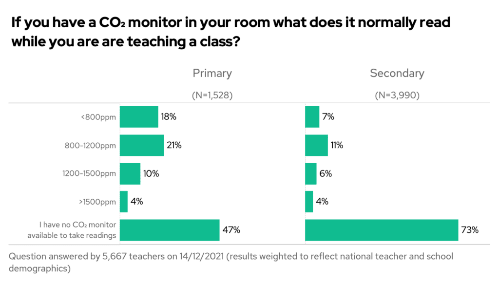 However, there is a problem! 47% of primary teachers and a huge 73% of secondary teachers reported not having a CO2 monitor in their classroom. So, while 7,000 may be almost enough to cover all the classrooms with a high CO2 reading, we don’t know all of the classrooms that will need them.
