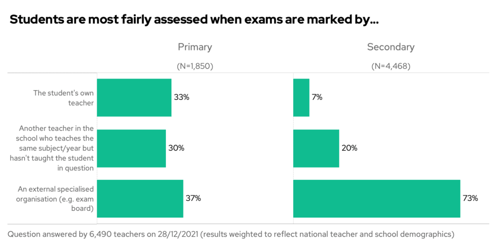 We don’t know what will happen in the next five months. However, many of you in secondary schools (73%) think students are most fairly assessed when exams are marked externally.