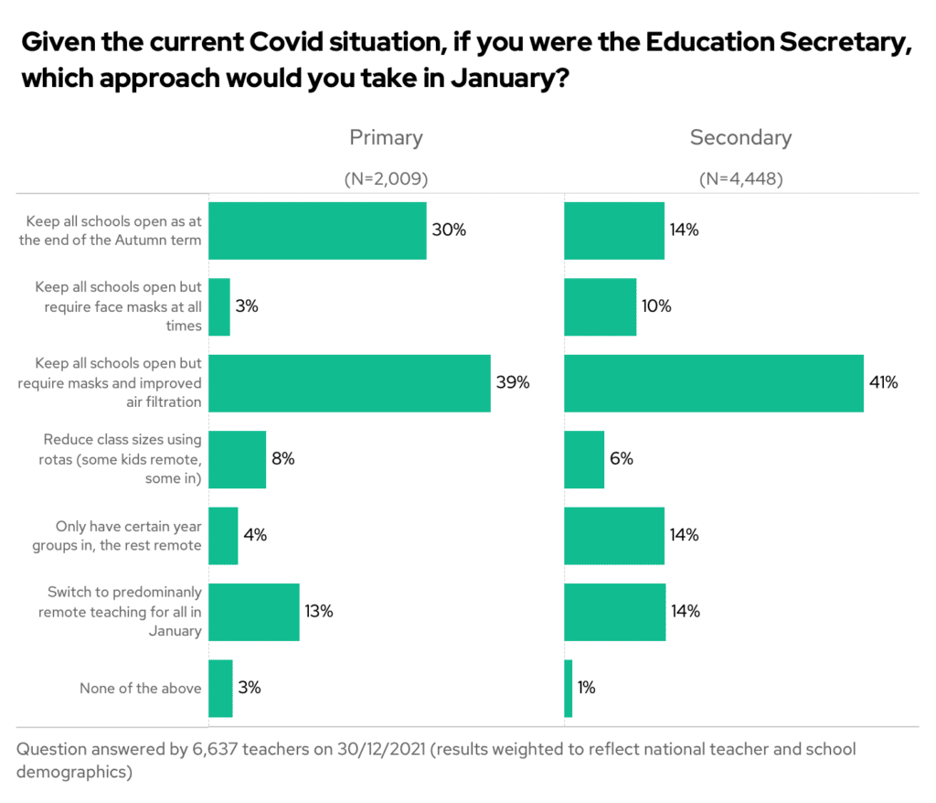 Many secondary teachers called for this when asked about their favoured approach this term – with 40% also wanting a focus on improving air filtration. Only one-in-four secondary teachers wanted at least a partial return to remote learning to counter the Omicron spike, with 14% wanting all pupils to learn from home.