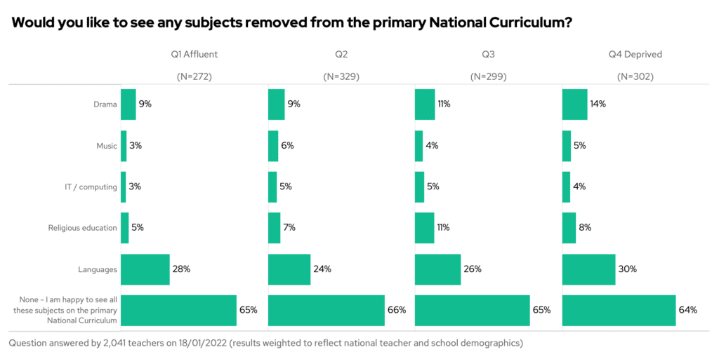 A more radical solution might be to remove a subject altogether! However, almost two-thirds of teachers would not want to see anything go.