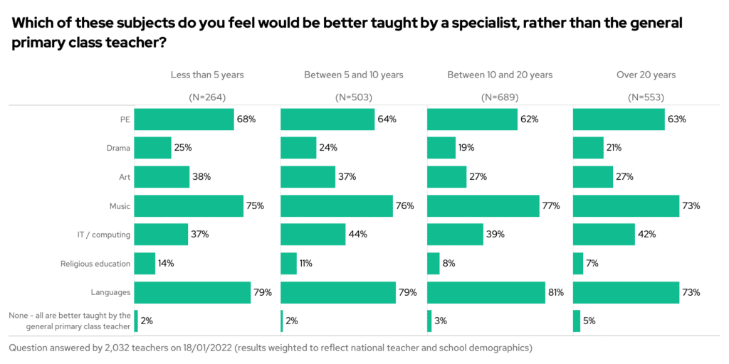 More experienced teachers have clearly honed their art 🎨 skills, though, as just 27% of teachers with 20+ years experience wanted art to be taught by a specialist, compared to 38% of new teachers. On the other hand, newly qualified teachers felt more able to teach IT / computing.