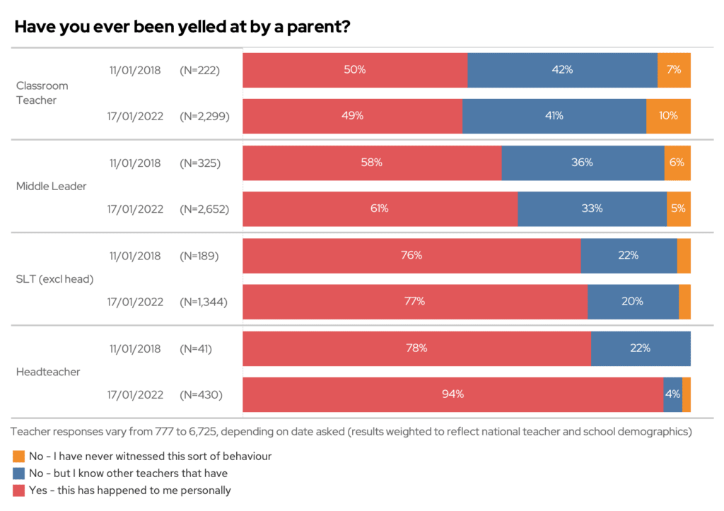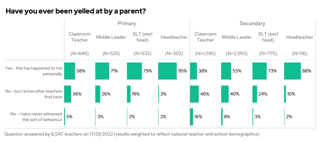 Over half of primary classroom teachers said that they had been yelled at by a parent, and 95% of primary heads reported the same! That said, secondary heads don’t fare much better – with 88% of secondary heads being on the receiving end.