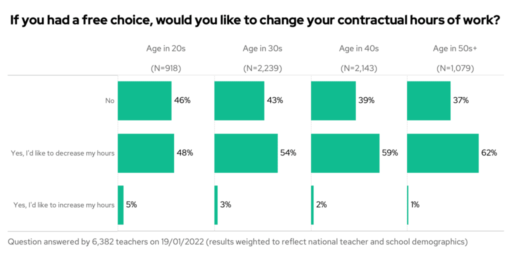 Decreasing hours was more popular among older teachers – with 62% of teachers in their 50s+ wanting this, compared to 48% of teachers in their 20s.