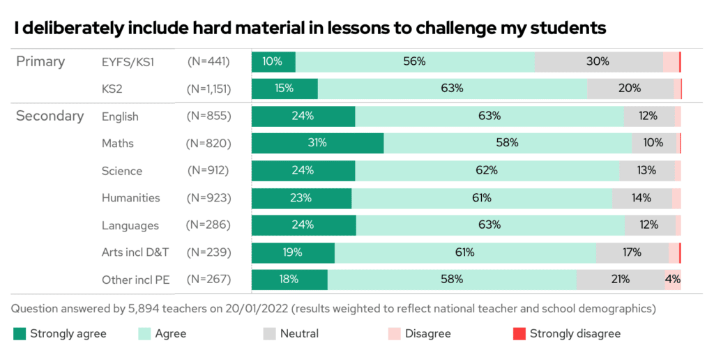 Note the jump between primary and secondary on this. In primary, fewer teachers said they were deliberately including hard materials to challenge lessons than in almost any secondary school subject. What is the reason for this shift? And could this be yet another reason why pupils find the transition from primary to secondary to be difficult?