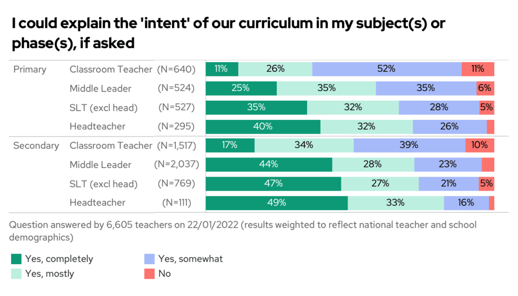 The most confident were the headteachers. In primary, 40% of heads say they can completely explain the ‘intent’ of their curriculum, and in secondary it was 49%.