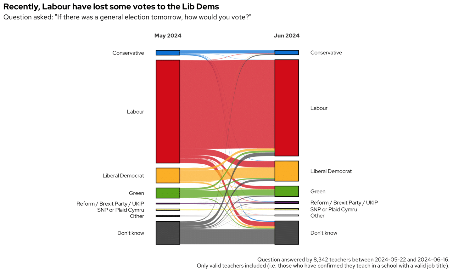 Labour have lost some votes to the Liberal Democrats and Greens – but also to the ‘Don’t Knows’. Unsure folks are one percentage point higher than last time, though that’s within our expected random variations so don’t read too much into it.