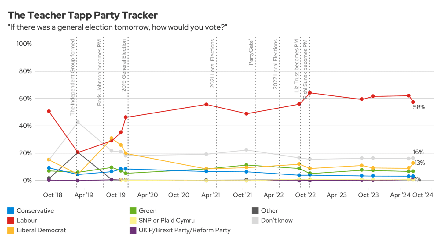 If the general election was called tomorrow, 58% would vote for Labour, 13% Liberal Democrat, 3% Conservative, 2% Reform and 16% still haven’t made their mind up.