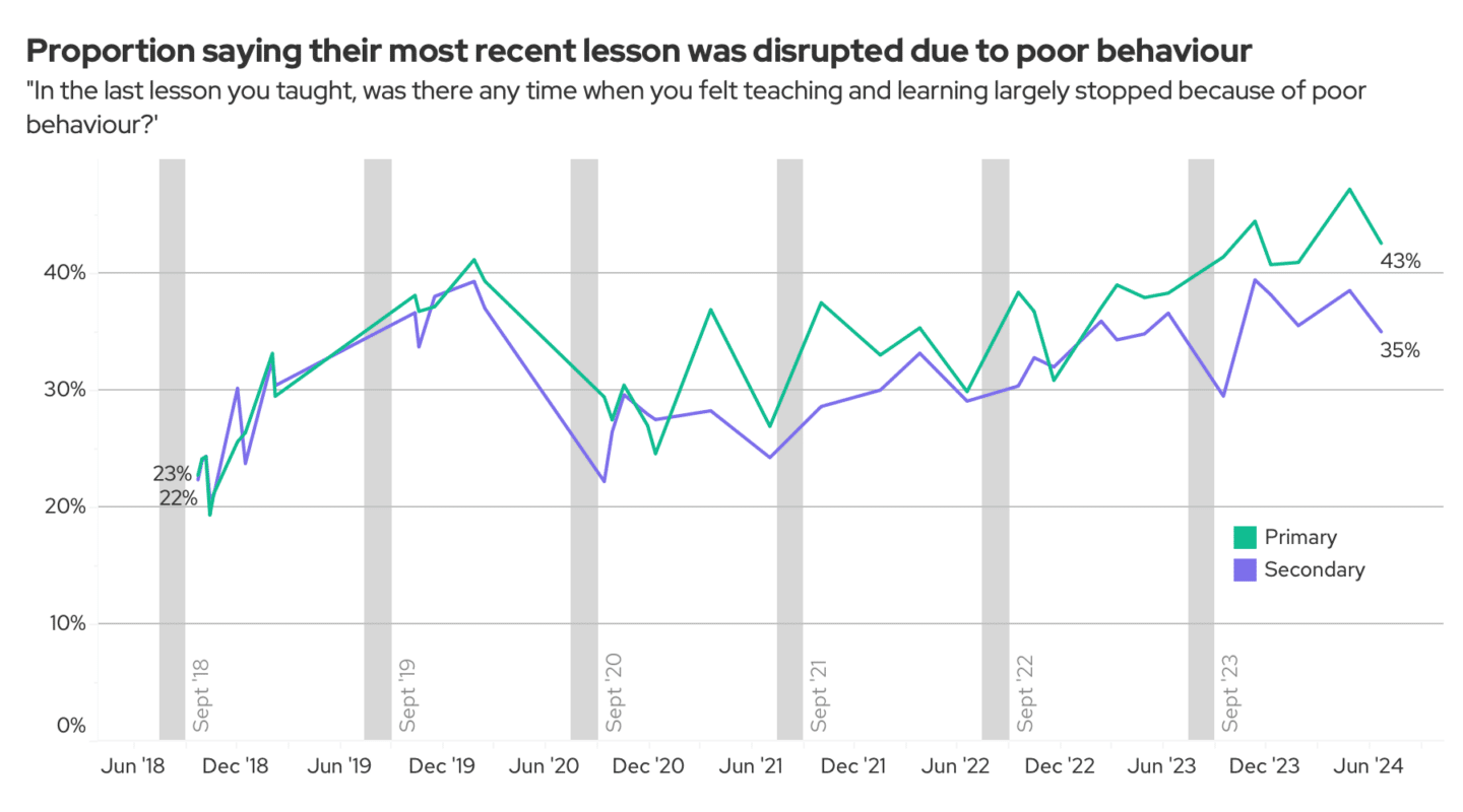 This June, just over a third of secondary teachers (35%) and 43% of primary teachers said learning stopped completely due to poor behaviour.