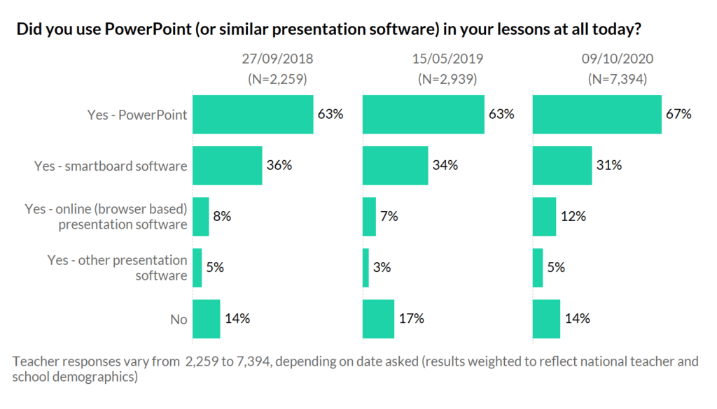Yet, looking at what’s happening in classrooms right now, their view seems… optimistic at best. Take the question below. For three years we’ve been asking about the use of PowerPoint in classrooms. Some people think slides are now out-of-date, but the data would suggest otherwise. More people were using it this week than ever before, whereas Smartboard software use has gone backwards in the same period.