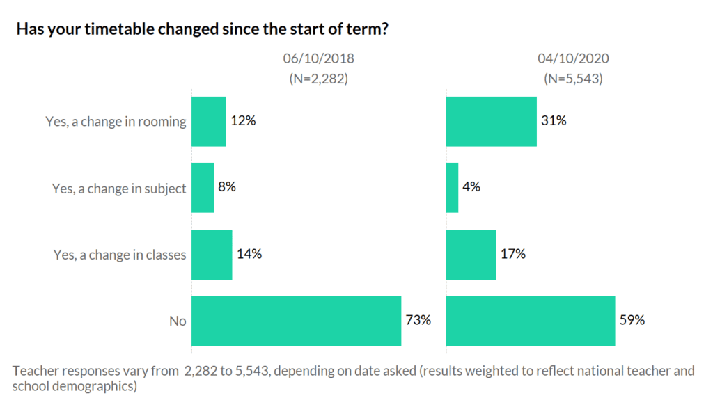 What has been disrupted this year is your timetable! One in three of you have had a room change since the start of term – that’s about three times higher than this time last year. Although that seems minor, changing rooms can be really unsettling for pupils who are getting used to seating plans and the way that rules operate in a classroom. On the upside, fewer of you have had a change in subject – so at least you won’t suddenly be planning a whole new set of unexpected lessons!