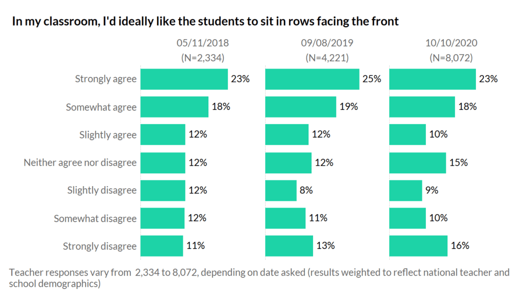 That said, teachers aren’t growing in their love of more traditional classroom options either. We already know that many more of you have desks laid out in rows this year, due to the Covid restrictions. Does it mean that you like it? The results below suggest a very similar view to previous years – though more of you strongly disagree with rows than before. Is that the influence of being forced to do it more often this year?!