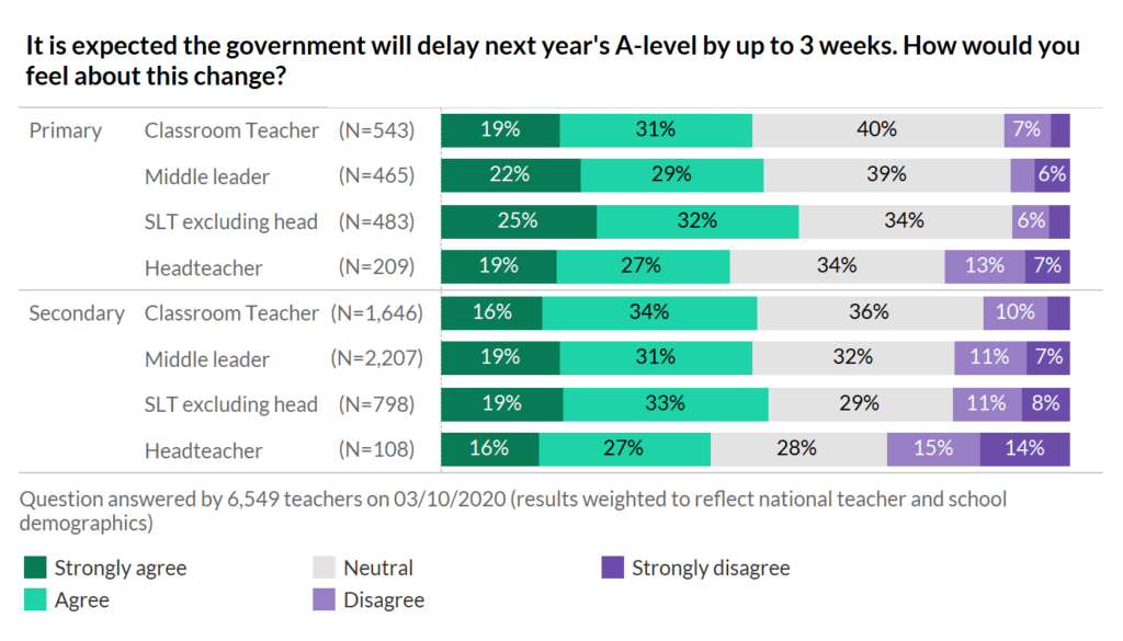 Ofqual have confirmed that A levels and GCSEs are to be delayed by up to 3 weeks. We didn’t know if GCSEs would be included in this policy when we asked how you felt about the policy last week. But you were more in favour of the policy than against. Except for heads, who were less persuaded (if still broadly in favour).