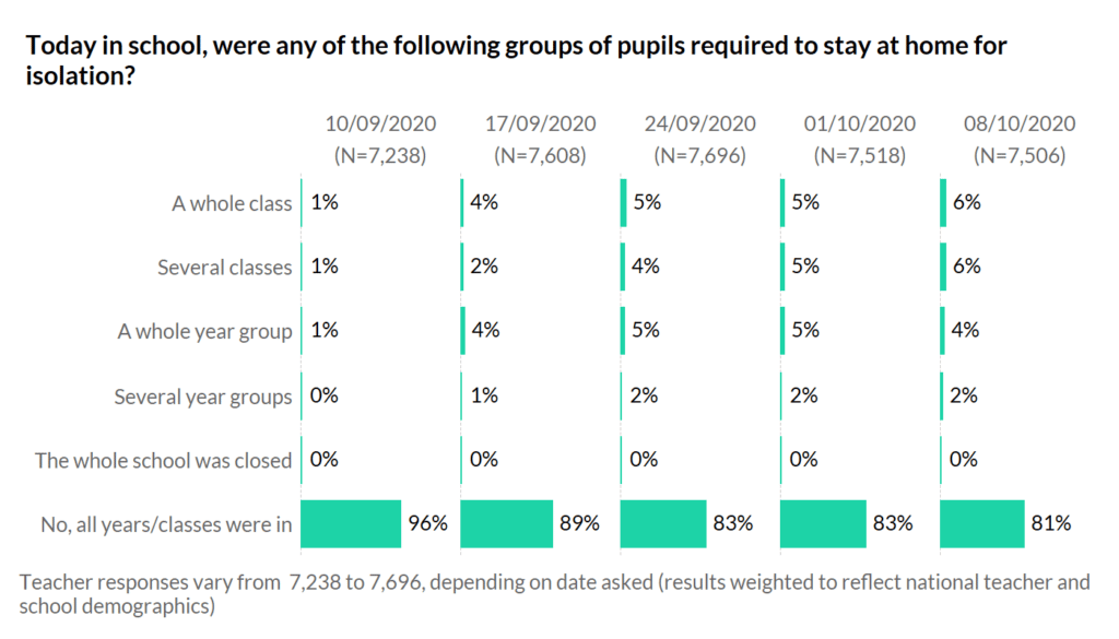 On Covid, we’ve now been collecting weekly figures on student stay homes every week for over a month. As the figure below shows, there has been a very gradual uptick in the number of schools with at least one class or year group at home. On any given day, the vast majority still have all large groups in – though there may still be substantial sub-groups at home.