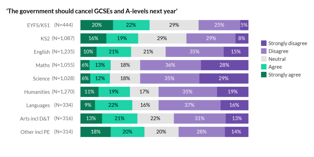 Delays are one thing. What about exam cancellation? On this, teachers are more undecided. Those in primary schools and subjects that have more coursework are the most in favour – but, even then, it’s fewer than half who are up for it.