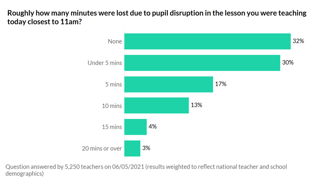 Around 1 in 3 teachers said that no minutes were lost during their 11 am lessons last Thursday. However, 7% of teachers said the time was 15 minutes or more. Assuming there’s around 500,000 teachers in schools, and assuming that at any given time around 75% are teaching, it would suggest that last Thursday, around 26,000 lessons were interrupted for 15 minutes or more. And if each class had 30 kids in, that’s about 780,000 children experiencing a disrupted learning experience.