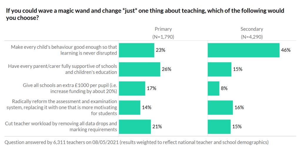 Primary teachers went for having every parent/carer fully supportive of the school. In contrast, secondary teachers overwhelmingly voted for making every child’s behaviour good enough to ensure learning is never disrupted.