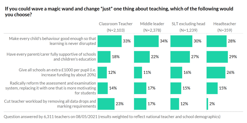 … or is their differing attitude down to role in school? Your results showed that headteachers were more likely to opt for parent support. In contrast, classroom teachers were more likely to pick behaviour and removing data drops/marking policies ahead of ensuring parental support. Another good reminder that our view of what should be changed in education often depends on our vantage point.