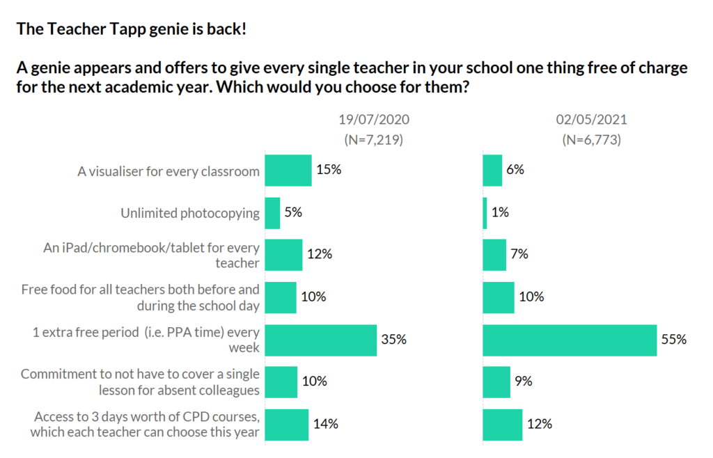 Over the years we’ve asked what you would give to every teacher in your school if a genie could wave a wand. An extra PPA period is always the most popular answer, although it is much more so this year compared to last summer.