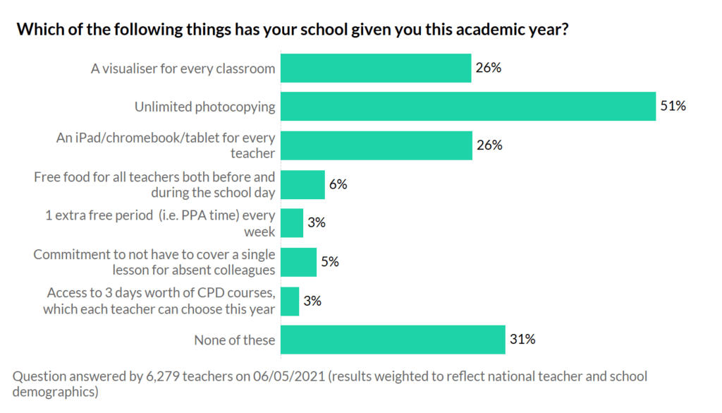 Almost 1 in 3 teachers said they didn’t get any of these perks this academic year. And many were shocked to see other teachers on social media saying they’d clicked many of the boxes – particularly the visualisers, iPad and photocopying boxes.
