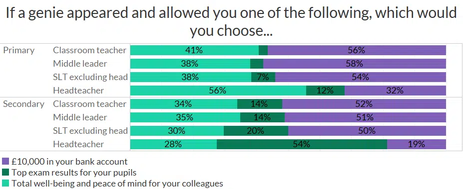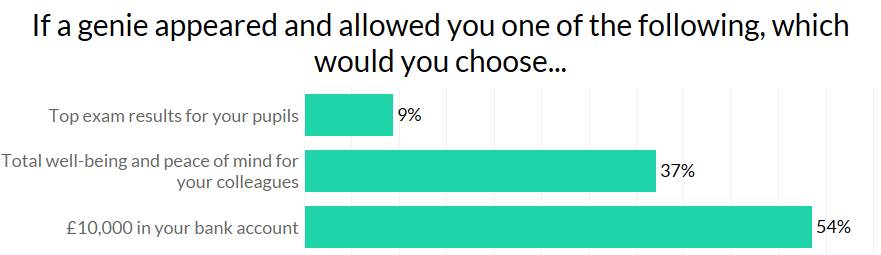 In the meantime, we’ve been repeating a beloved question from earlier in the year. Back in January we asked teachers to pick one of three trade offs: top exam results, well-being for colleagues, or £1 million in their bank account.