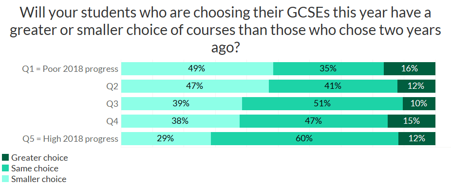 Another set of murmurs is that students now have less choice in their GCSEs than they did a few years ago because Progress 8 and the budget cuts have combined to reduce options. Ministers have mostly insisted that option choices are not dropping. Those ministers appear to be wrong.