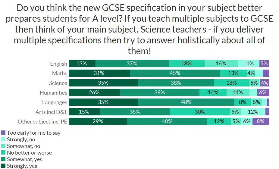 When it comes to preparation for higher level study, maths, science, and MFL teachers are the happiest about the new GCSE specifications. English teachers are the least happy (though, on balance, are more happy than not).