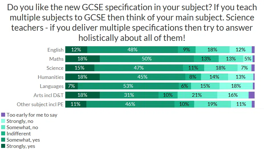 English teachers are less effusive than others, though it’s worth noting that given all the concerns the most common answers is that teachers somewhat like the new specs. So at least there’s that!