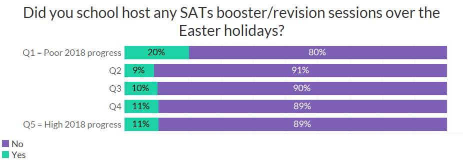 Indeed, we found that a poor 2018 progress score made a school twice as likely to have SATs booster/revision classes, so it could be that leaders who already have an outstanding grade, but saw their results dip last year, are now looking to ensure good grades are achieved this year.