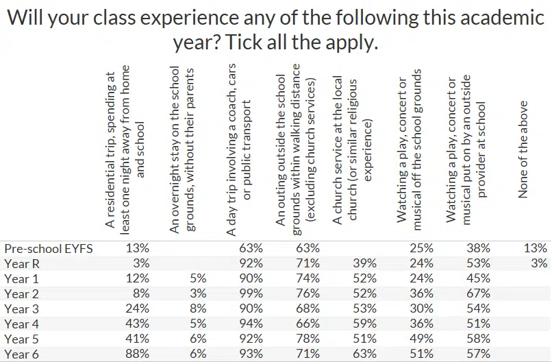 For example, 88% of Year 6 teachers said their pupils will go on a residential trip this year. And 67% of Year 2 teachers said their pupils will watch a play, concert or musical.