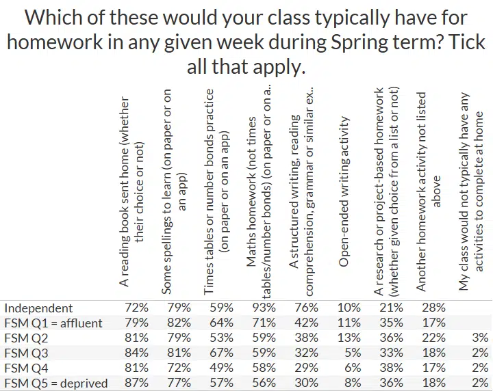 Pupils at independent schools are less likely to get given homework projects and reading, but instead get maths and structured writing. Pupils from the schools in particularly poor areas are the least likely to get these activities. Does this matter? Again, thoughts appreciated on this one. (Do email or tweet).