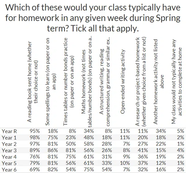 Schools minister Nick Gibb will also be pleased to find out that in any given week during the spring term, pupils are getting spellings to learn, reading books sent home, and some kind of maths homework, with a particular focus on times tables in Year 3 as expected). Though he might be slightly grumpy that around a third of children also get ‘project-based’ homework. (Nick Gibb is not a man who likes projects.)