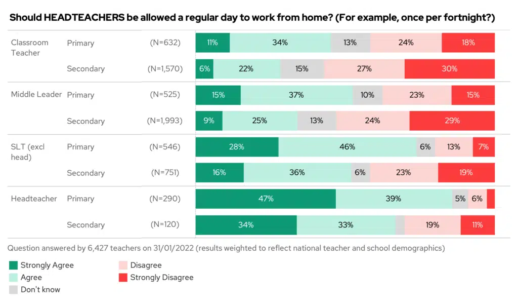 While just 40% of classroom teachers and middle leaders thought that heads should be allowed a regular day to work from home, 81% of headteachers thought the same.
