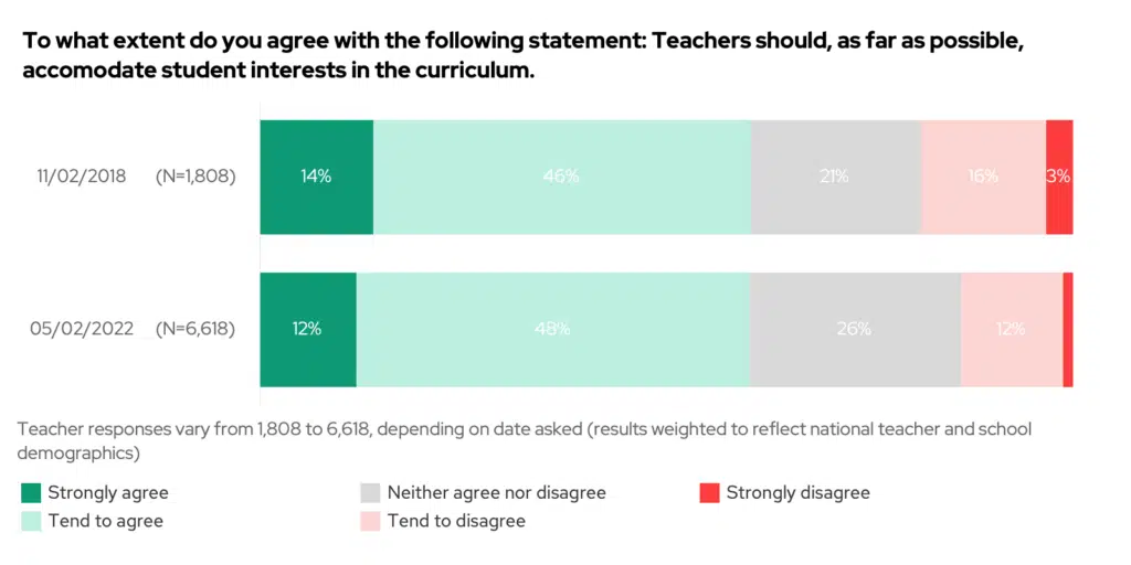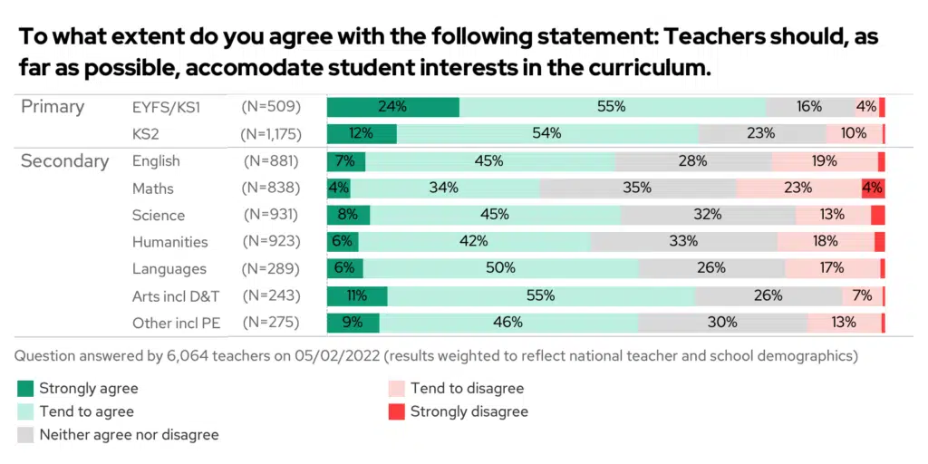 Primary teachers are still the strongest believers, with 70% of primary teachers agreeing that the curriculum should accommodate student interests. Secondary teachers remain divided; with just 38% of maths teachers, but 66% of arts teachers agreeing.