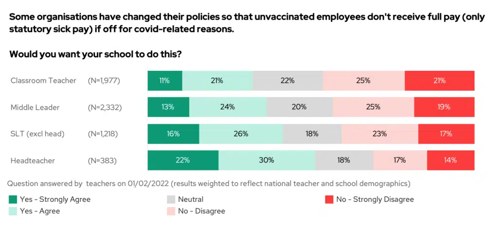 As everyone is grappling with staff absences, there’s been some unrest about the longer isolation periods for those who are unvaccinated and the pressure this places on schools. For this reason, some organisations (not schools) have changed the rules so that unvaccinated persons off for covid-related reasons only receive statutory sick pay (rather than full pay).