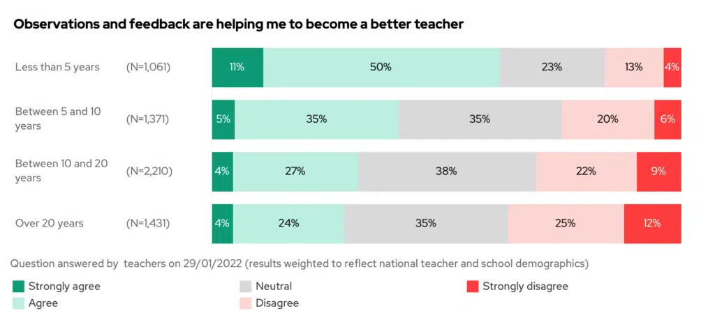On the other hand, newly qualified teachers – with less than 5 years experience – were more often singing their praises, (with 61% saying that observations are helpful).