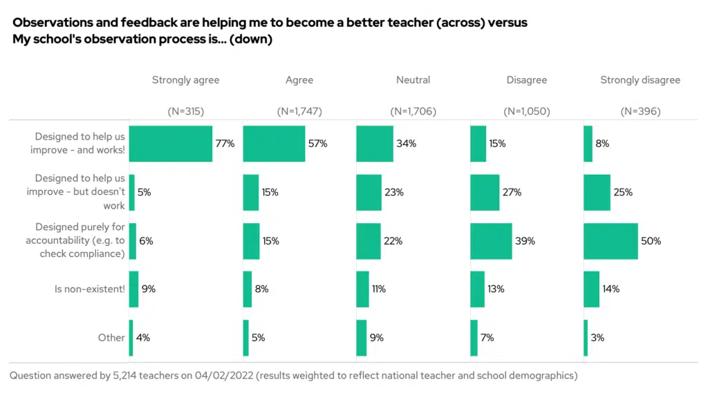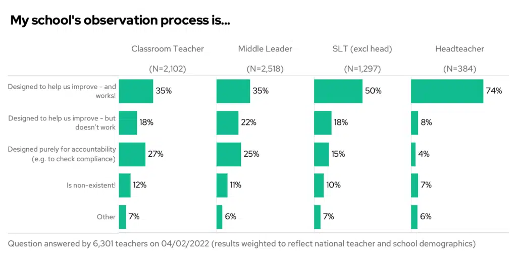 Note the big difference in how classroom teachers vs senior leaders feel about their school’s observation process. Only 4% of heads say the process is designed for accountability and compliance – compared to 27% of classroom teachers.