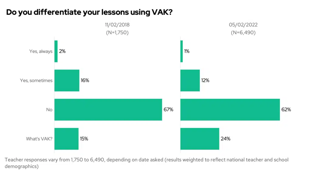 As of the past month, only 13% of teachers say are differentiating using VAK. And, perhaps more importantly, there has been a marked increase in teachers who know nothing about VAK – having risen from 15% in 2018 to 24% now!