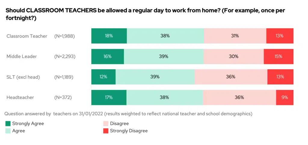 Headteachers were similarly positive – with 55% also thinking that classroom teachers could have a day to work from home, but not as positive when compared to headteachers working from home!