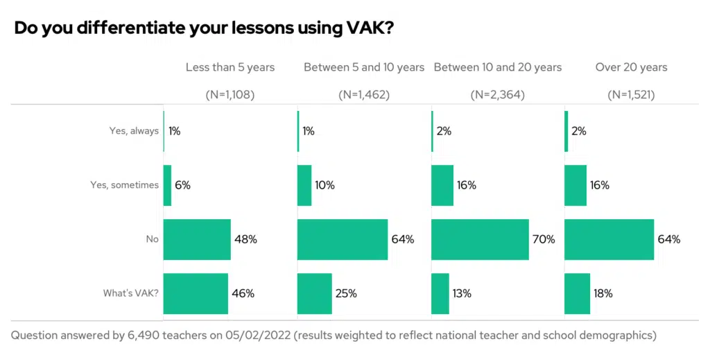 How did this happen? Well, it’s the less experienced teachers amongst you, coming up through the ranks now, who have never heard of it – with 46% saying they don’t know what VAK is!