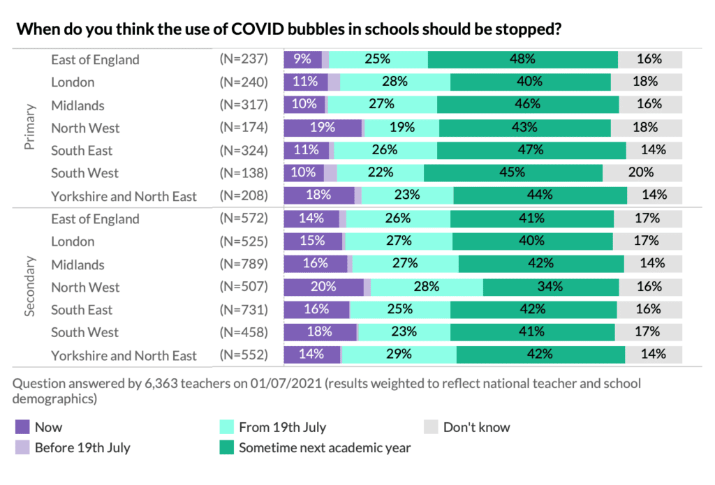 Boris Johnson has now announced that Covid Bubbles will cease from 19th July. Around 1-in-4 (25%) teachers agreed with the date, and a further 43% agreed with bubbles stopping in September.