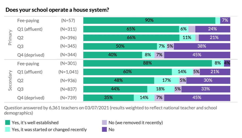 But presumably there are some upsides since so many schools use house systems. We have been surprised to see the social divide in how prevalent they are. Over 9-in-10 fee-paying schools have them; three-quarters of affluent state schools have them but only around half of the state schools serving the most deprived communities use house systems.