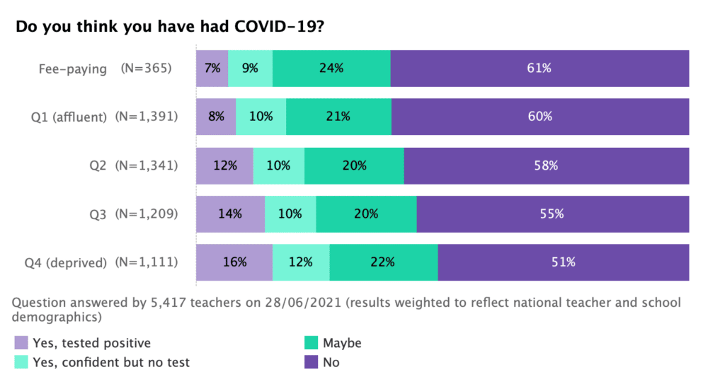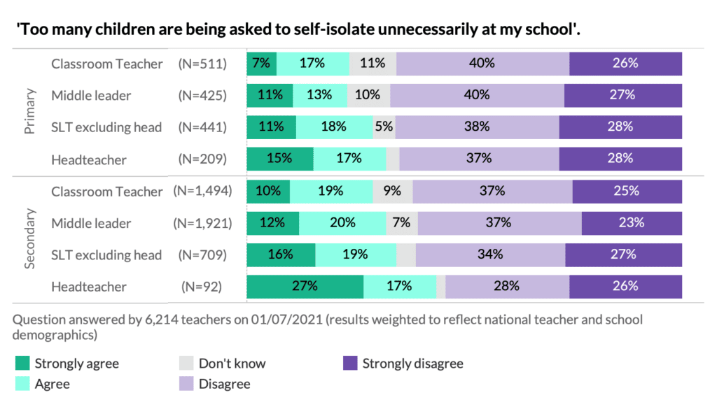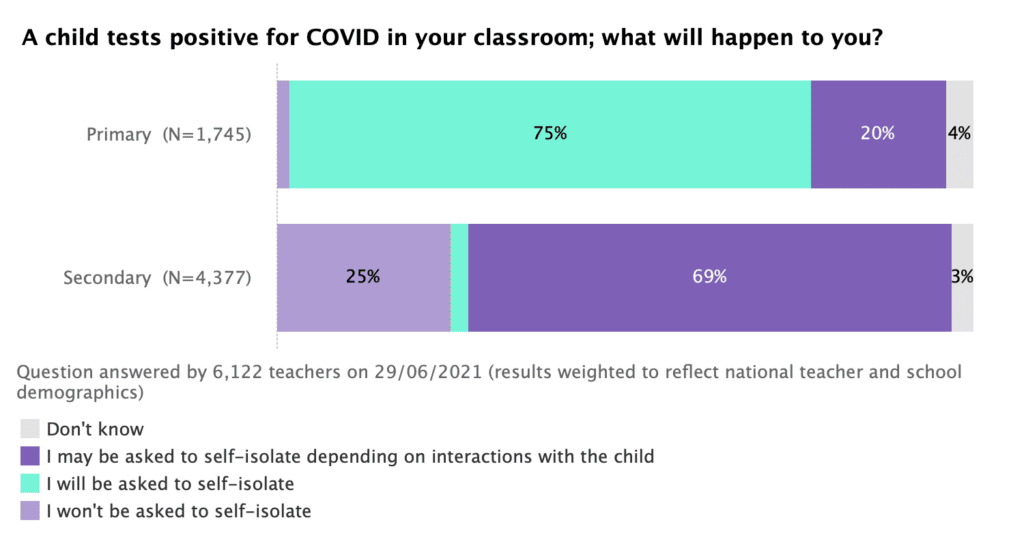 Well, if a child tests positive in a primary school then their class teacher will likely be asked to self-isolate (75%). In secondary schools, the situation depends on interactions with the child – for example, how near you got to a child. The greater discretion in secondary school means more teachers have been able to say in the classroom.