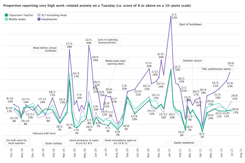 As before, we can see that head teachers consistently report the highest levels of anxiety. Right from the first lockdown, through until now. Poor communication and last-minute changes at the start of the year caused a spike of 53% of head teachers and 30% of the rest of you reporting high levels of anxiety at that time. For heads this is a remarkably high rate. In usual times (the far left of the graph) only around 14% of heads report high levels of work-related anxiety.