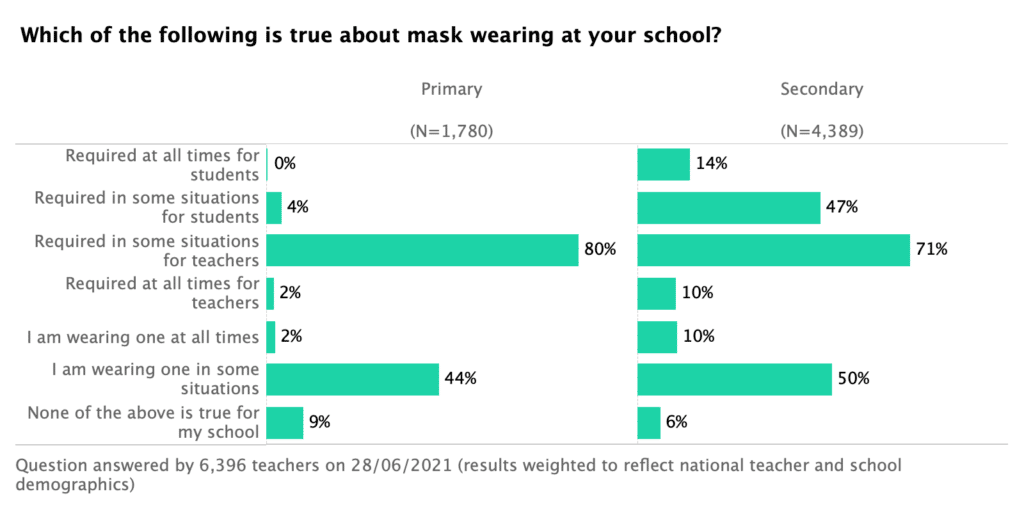 In May, schools were told that pupils do not need to continue wearing masks in the classroom. Some schools have decided to keep pupils wearing masks, in some cases due to local risk levels. The trend is much more common in secondary schools, but 4% of primary schools also require some students to wear them in certain circumstances.