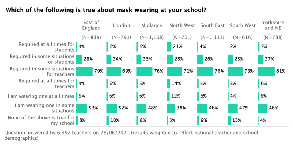 In the North West, 50% of schools are requiring masks at least some of the time. Separating the results out by phase, we think nearly all secondary schools in that region are requiring students to wear masks and they are 3 times as likely as other regions to require students to wear masks all the time.