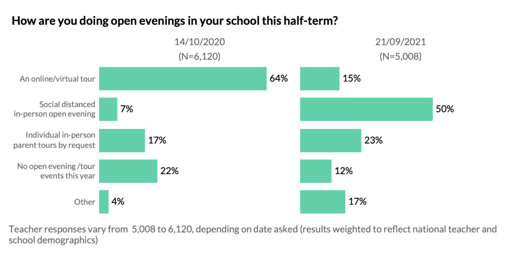 It’s all change again this year as more schools are opening their doors to parents once again! 50% of schools are hosting a socially distanced open evening. We’ve also seen a decrease in the percentage of schools not having an open evening this year – from 22% down to just 12%.