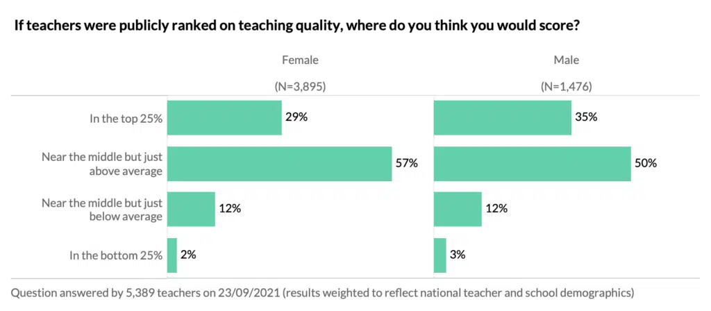 Brand new analysis this year shows that male teachers are more confident in their abilities, with 35% saying they would come in the top 25% compared to 29% of women. That said, a similar percentage of male and female teachers said they were in the bottom half of the rankings.