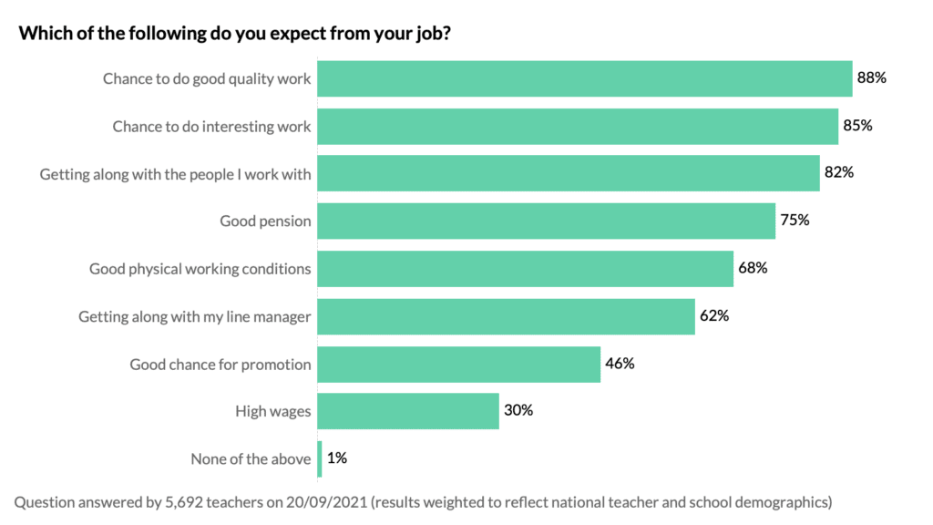 No one ever said teachers are in it for the money, but still we were surprised at quite how far down your list of expectations high wages comes! More important to you by far are opportunities for good quality and interesting work. Getting along with the people you work with is way up there too 🤗