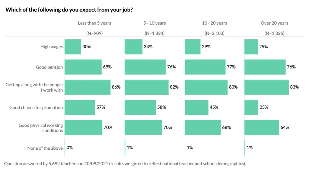 Do your expectations change the longer you’re in teaching? The main change (perhaps unexpectedly) is your expectations of getting a promotion: 57% of teachers in their first 5 years have this expectation, compared to just 25% of those who’ve been in the profession 20 years or more.