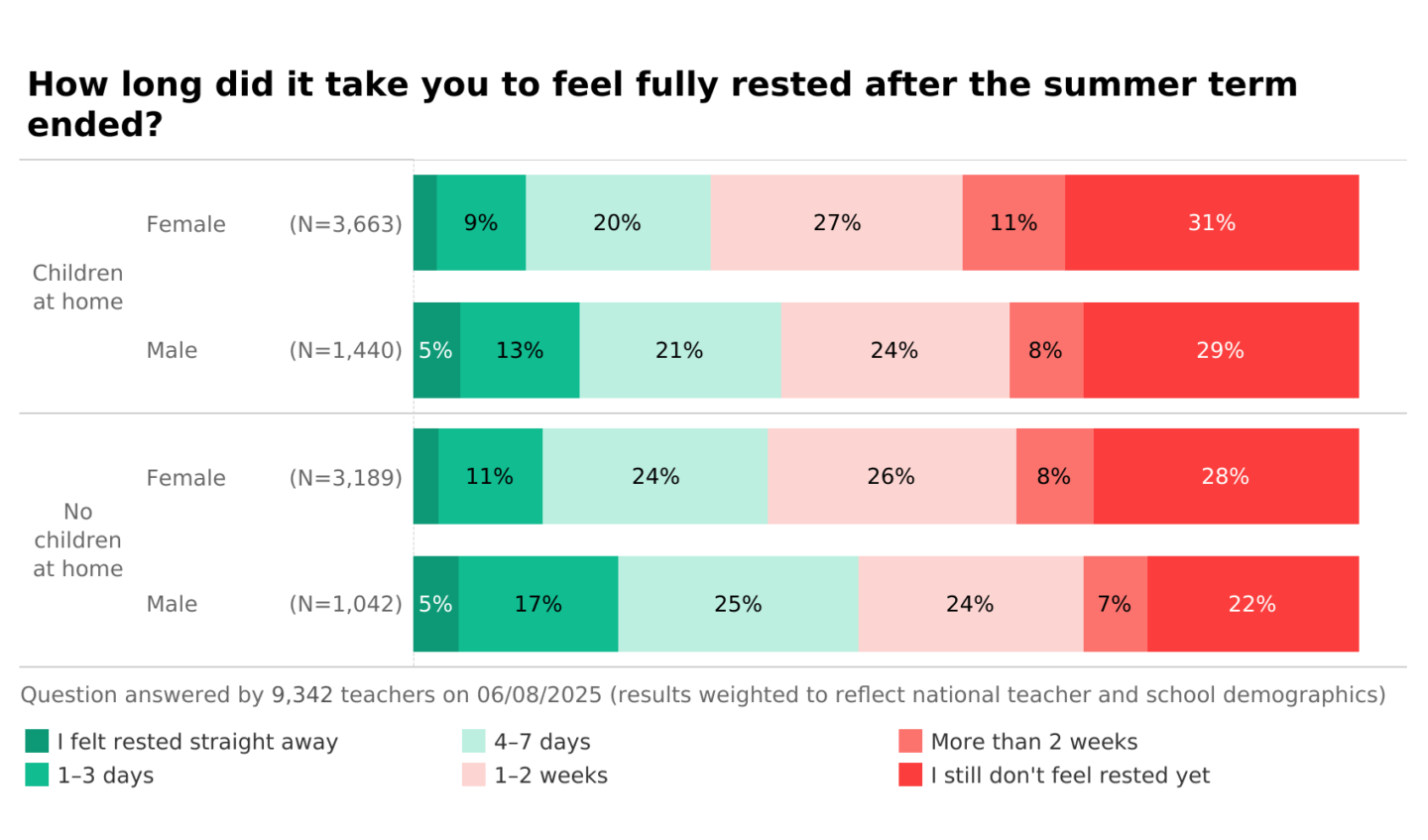 Female teachers with children at home are the most likely to report they still don’t feel fully rested (31%) compared to male teachers with no children at home (22%).